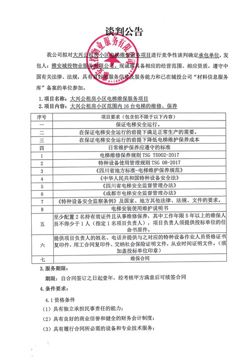 城投物業(yè)公司大興公租房小區(qū)電梯維保服務(wù)項(xiàng)目競(jìng)爭(zhēng)性談判公告