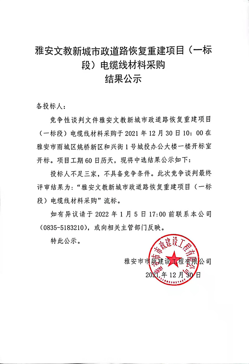 雅安文教新城市政道路恢復重建項目(一標段)電纜線材料采購競爭性談判公告