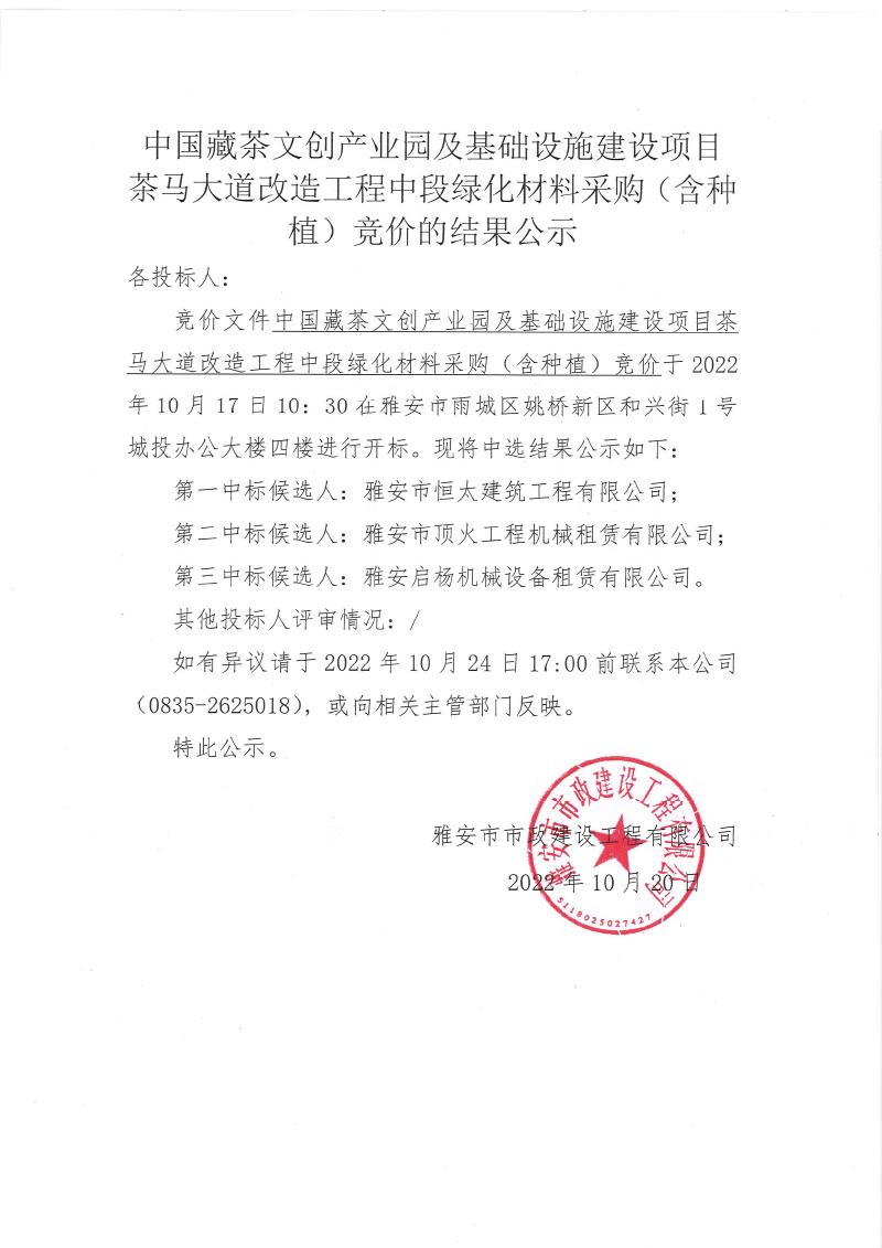 中國(guó)藏茶文創(chuàng)產(chǎn)業(yè)園及基礎(chǔ)設(shè)施建設(shè)項(xiàng)目--茶馬大道改造工程中段綠化材料采購(含種植)競(jìng)價(jià)的結(jié)果公示