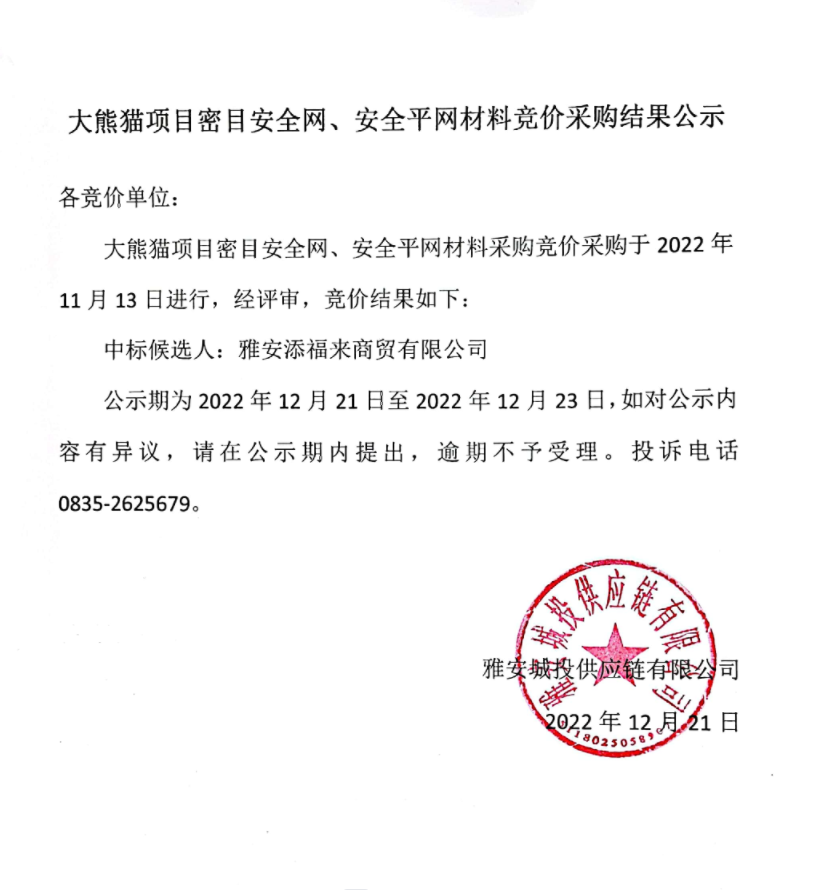 大熊貓項(xiàng)目密目安全網(wǎng)、安全平網(wǎng)材料競(jìng)價(jià)采購(gòu)結(jié)果公示