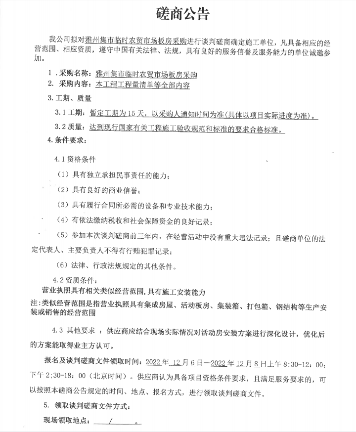 雅州集市臨時農(nóng)貿(mào)市場板房采購磋商公告