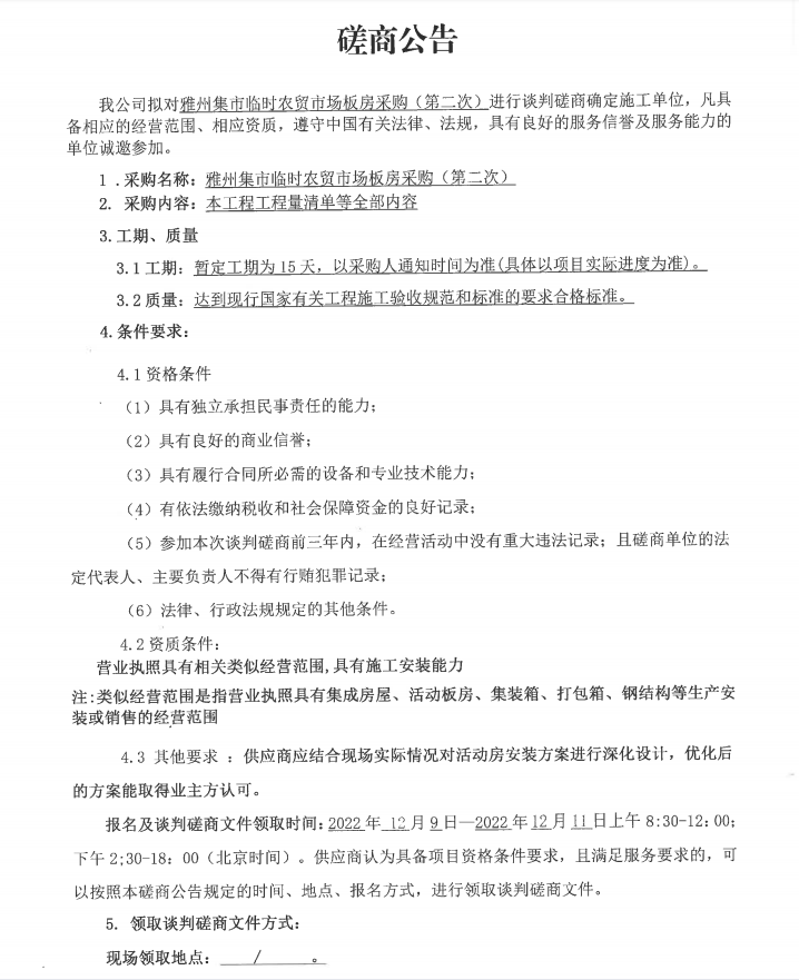 雅州集市臨時農(nóng)貿(mào)市場板房采購(第二次)磋商公告