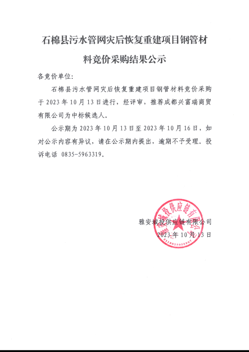 石棉縣污水管網(wǎng)災(zāi)后恢復(fù)重建項(xiàng)目鋼管材料競(jìng)價(jià)采購(gòu)結(jié)果公示