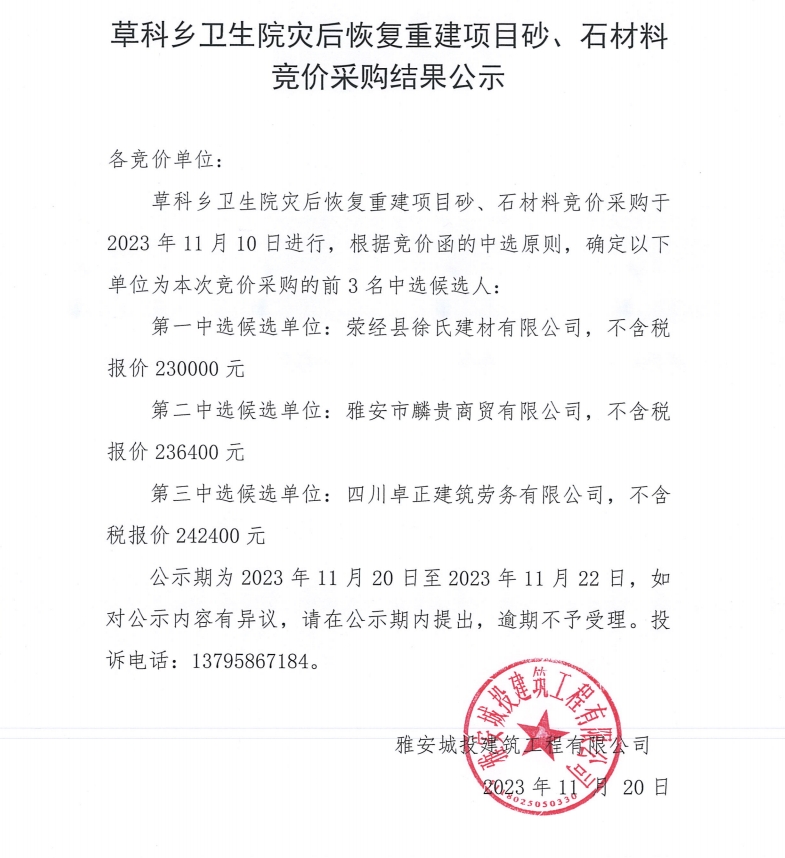 草科鄉(xiāng)衛(wèi)生院災后恢復重建項目砂、石材料競價采購結(jié)果公示