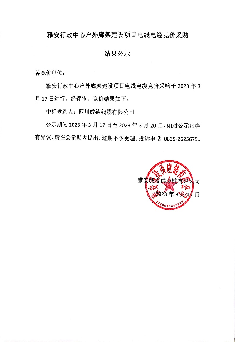 雅安行政中心戶外廊架建設(shè)項目電線電纜競價采購結(jié)果公示