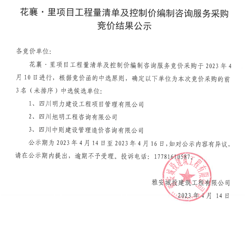 花襄·里項目工程量清單及招標(biāo)控制價編制咨詢服務(wù)采購競價結(jié)果公示