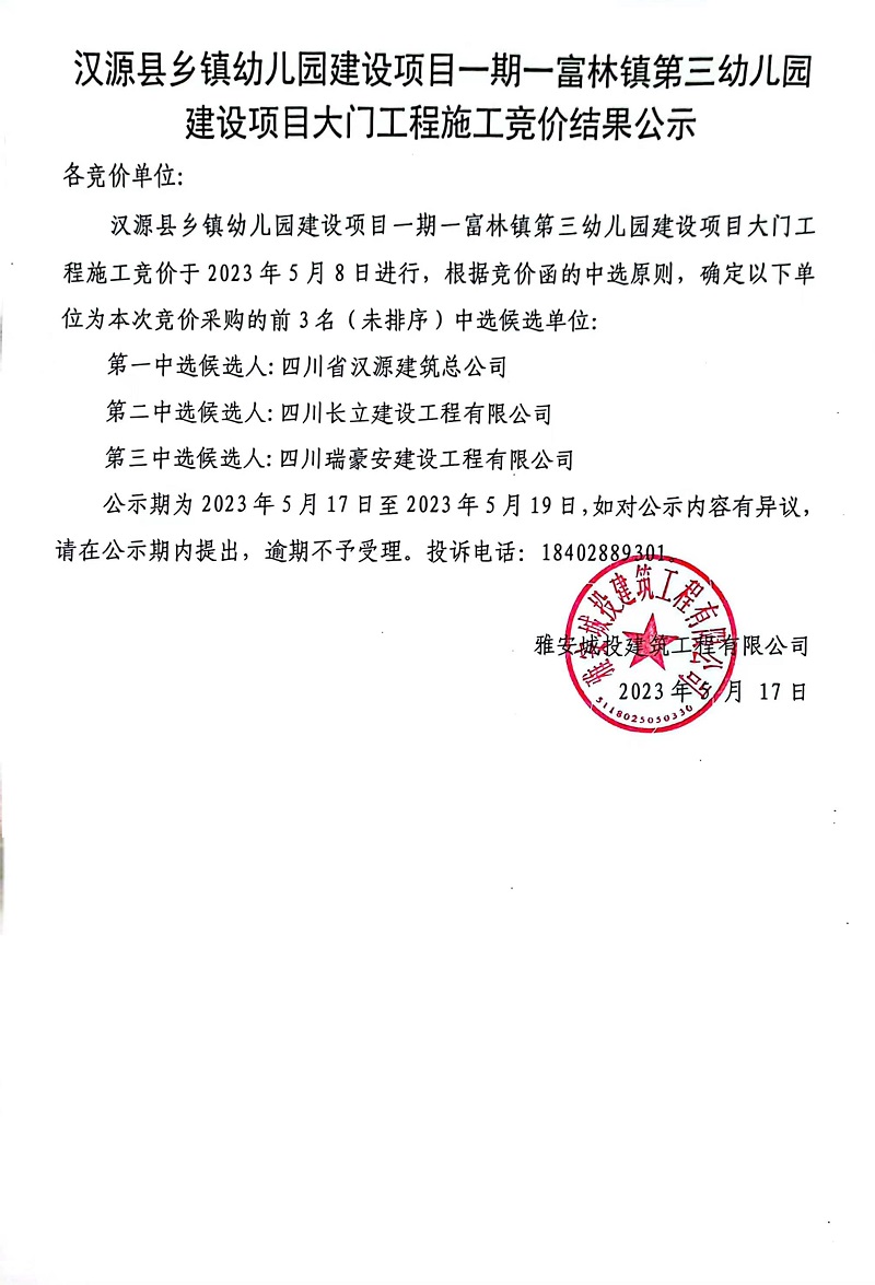 漢源縣鄉(xiāng)鎮(zhèn)幼兒園建設項目一期一富林鎮(zhèn)第三幼兒園建設項目大門工程施工競價結果公示