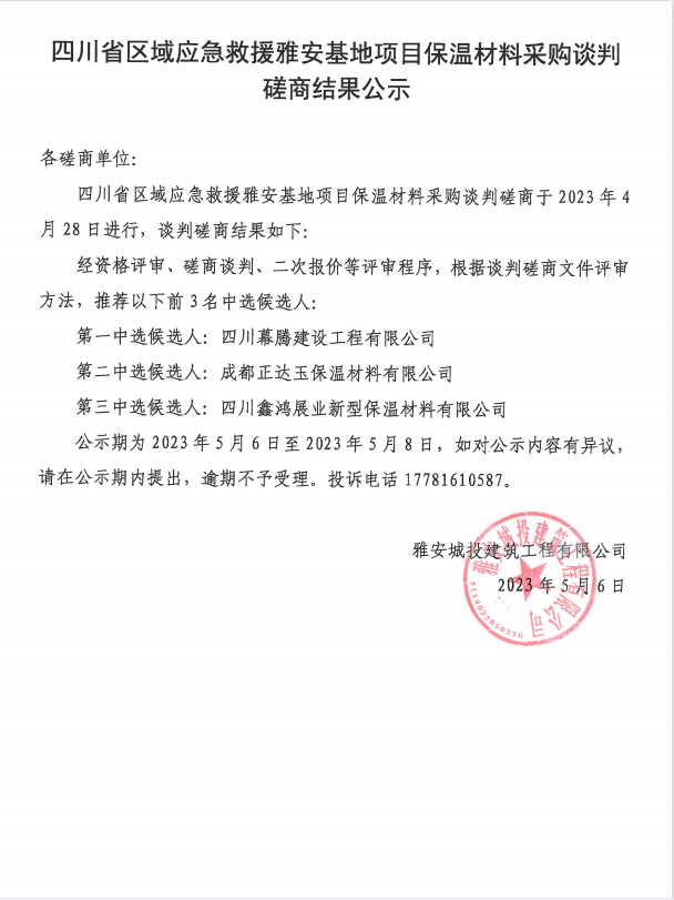 四川省區(qū)域應(yīng)急救援雅安基地項(xiàng)目保溫材料采購(gòu)談判磋商結(jié)果公示