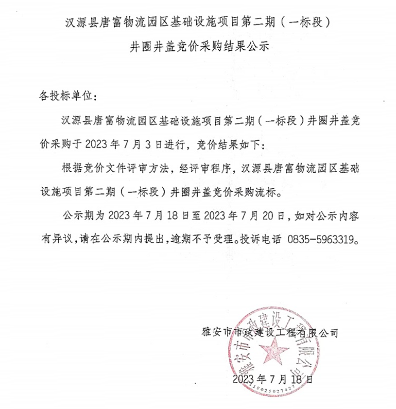 漢源縣唐富物流園區(qū)基礎(chǔ)設(shè)施項(xiàng)目第二期(一標(biāo)段)井圈井蓋競(jìng)價(jià)采購結(jié)果公示