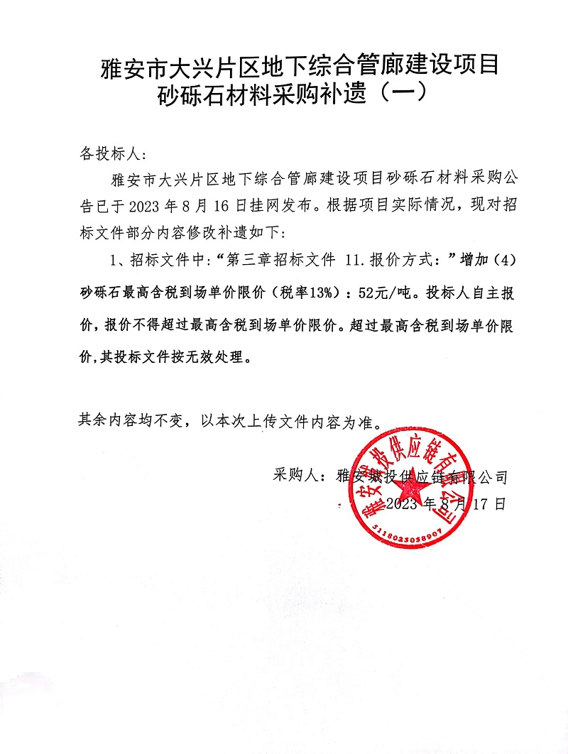 雅安市大興片區(qū)地下綜合管廊建設項目砂礫石材料采購補遺(一)