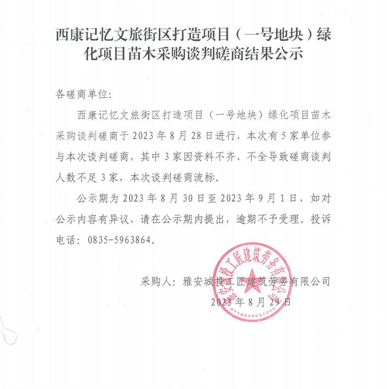 西康記憶文旅街區(qū)打造項(xiàng)目(一號地塊)綠化項(xiàng)目苗木采購談判磋商結(jié)果公示