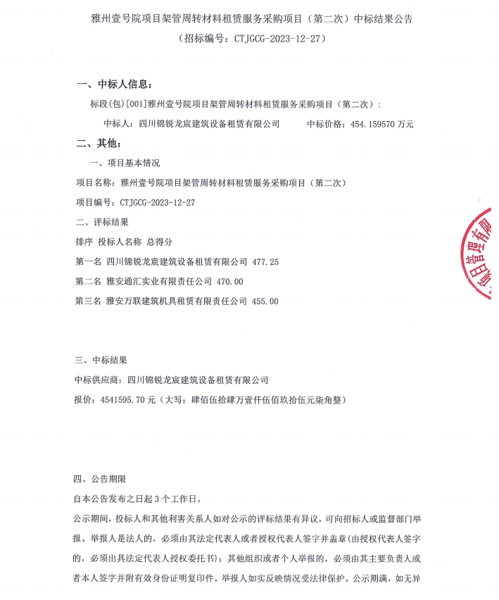 雅州壹號(hào)院項(xiàng)目架管周轉(zhuǎn)材料租賃服務(wù)采購(gòu)項(xiàng)目(第二次)中標(biāo)結(jié)果公告