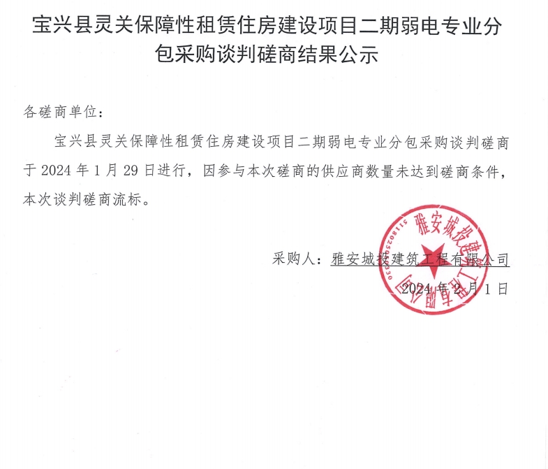 寶興縣靈關保障性租賃住房建設項目二期弱電專業(yè)分包采購談判磋商結果公示