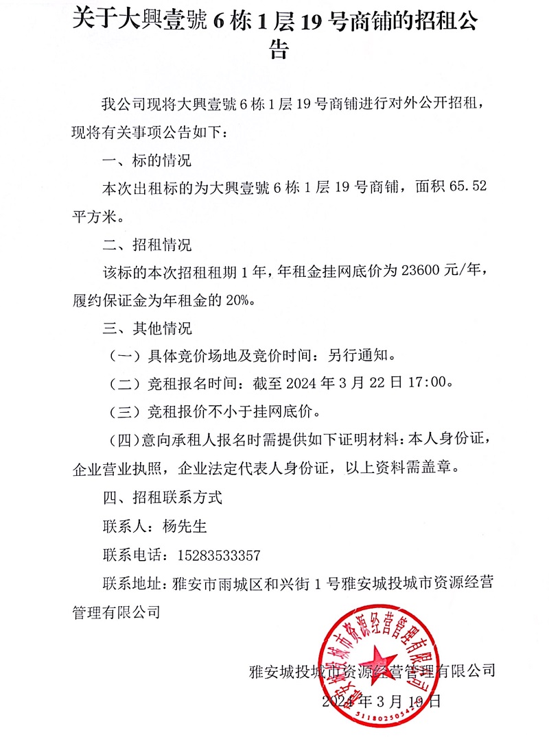 關(guān)于大興壹號6棟1層19號商鋪的招租公告