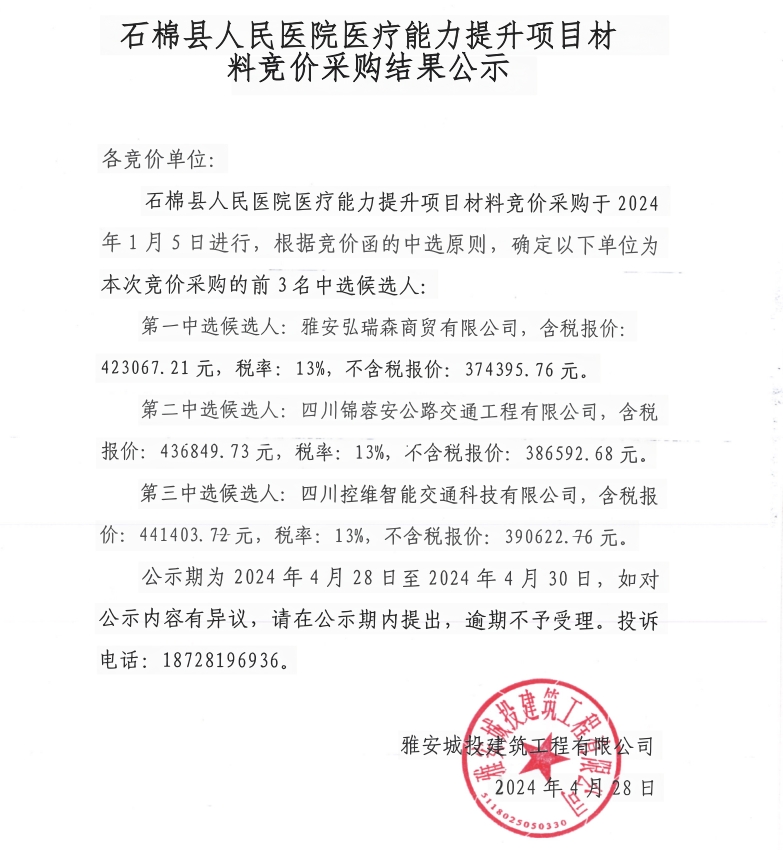 石棉縣人民醫(yī)院醫(yī)療能力提升項目材料競價采購結(jié)果公示