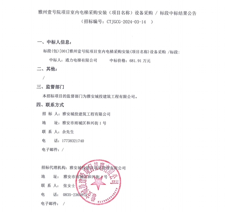 雅州壹號院項目室內(nèi)電梯采購安裝(項目名稱)設(shè)備采購/標(biāo)段中標(biāo)結(jié)果公告