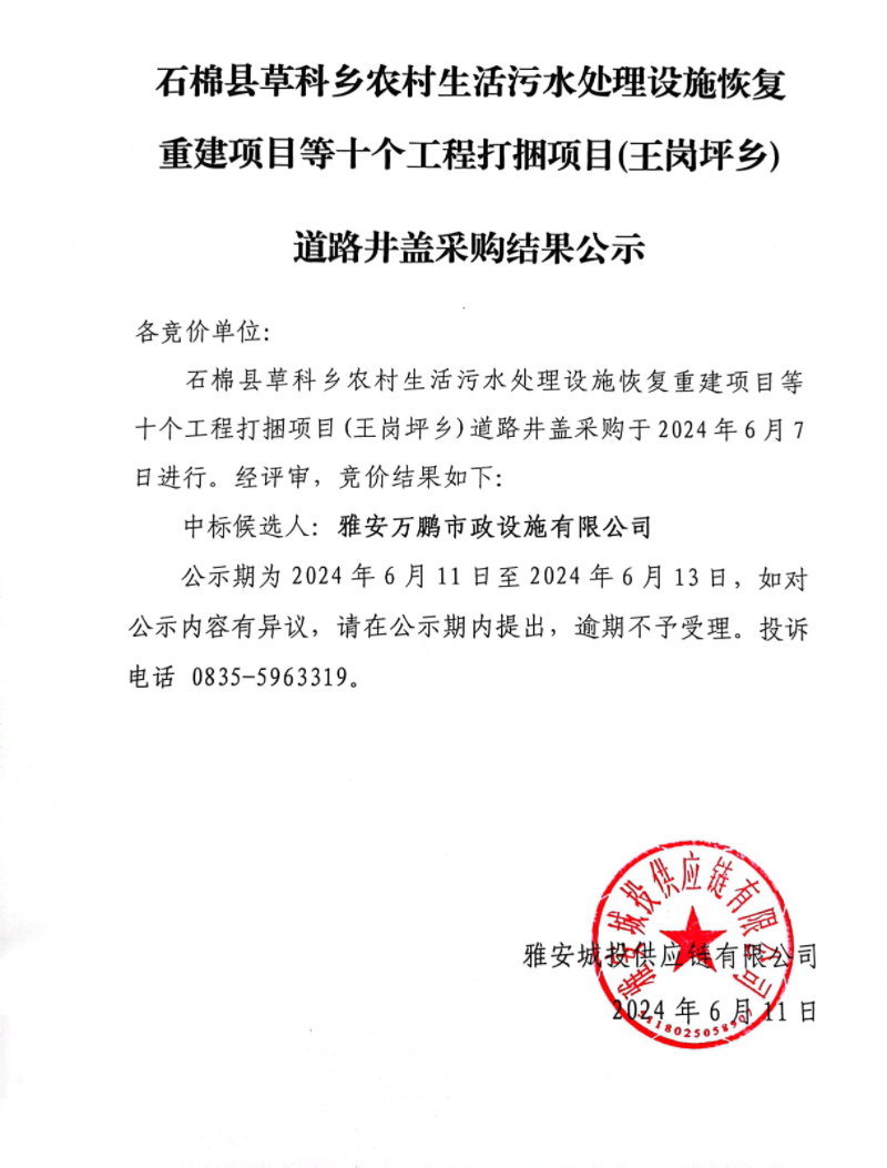 石棉縣草科鄉(xiāng)農村生活污水處理設施恢復重建項目等十個工程打捆項目(王崗坪鄉(xiāng))道路井蓋采購結果公示