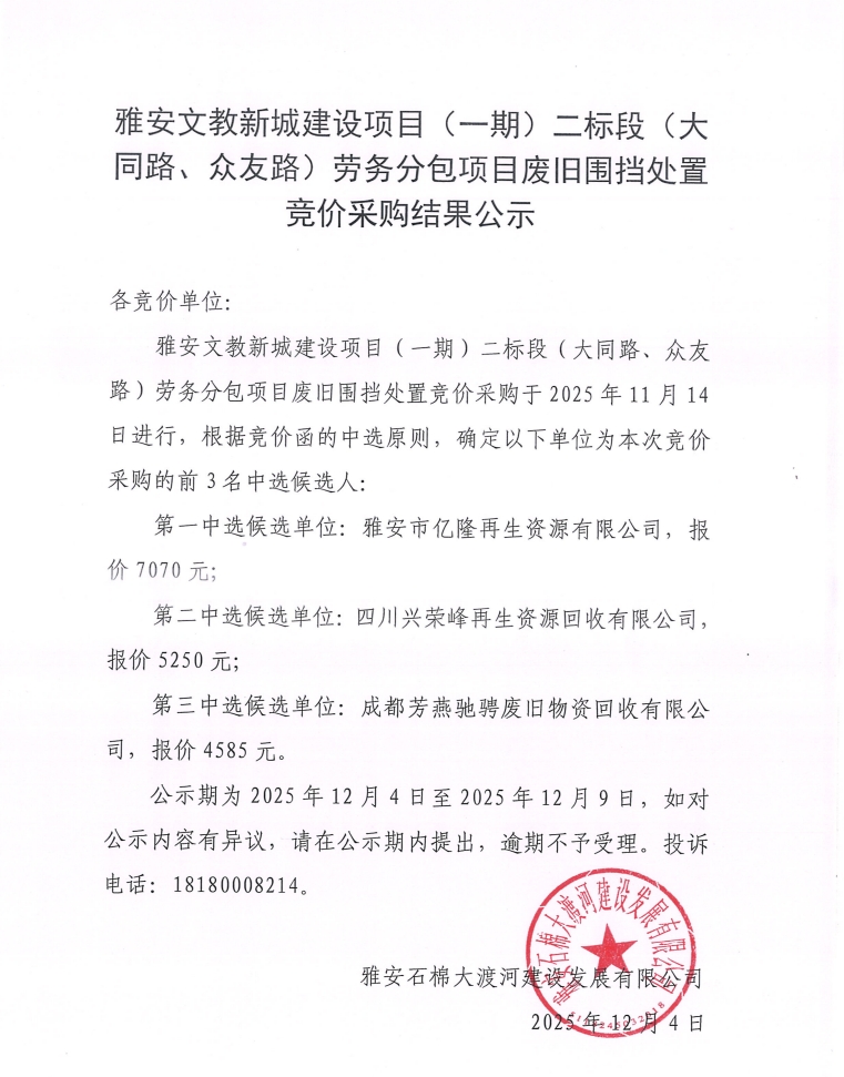 雅安文教新城建設項目(一期)二標段(大同路、眾友路)勞務分包項目廢舊圍擋處置競價采購結(jié)果公示