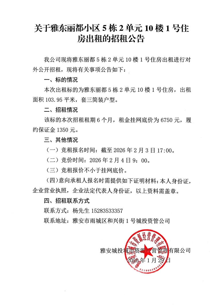 關于雅東麗都小區(qū)5棟2單元10樓1號住房出租的招租公告