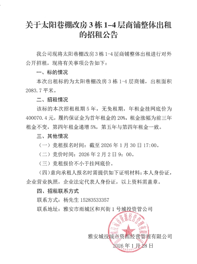 關(guān)于太陽(yáng)巷棚改房3棟1-4層商鋪整體出租的招租公告