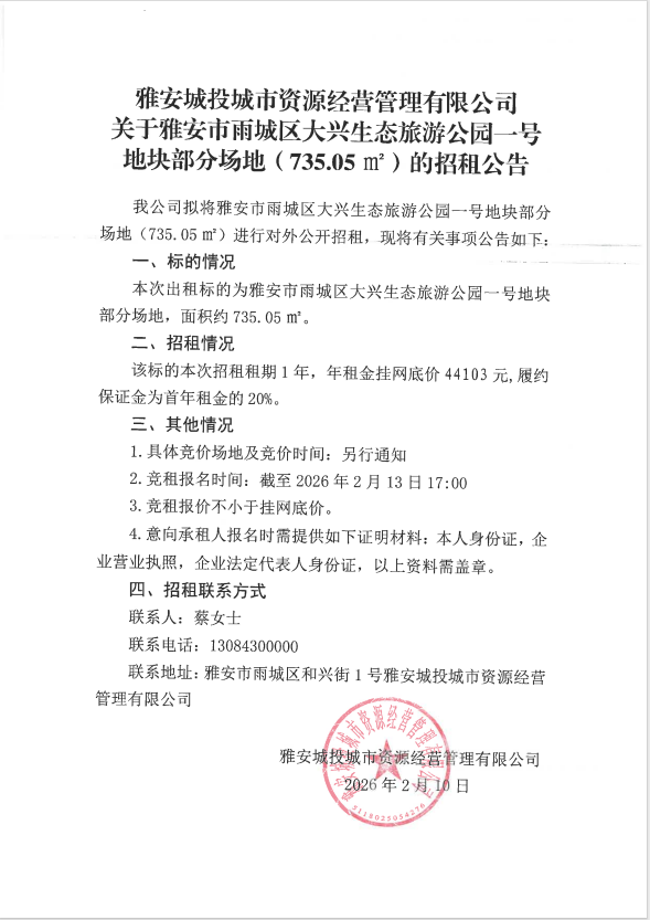 雅安城投城市資源經(jīng)營(yíng)管理有限公司關(guān)于雅安市雨城區(qū)大興生態(tài)旅游公園一號(hào)地塊部分場(chǎng)地(735.05㎡)的招租公告