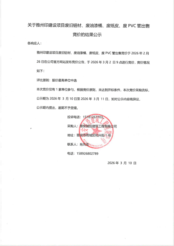 關(guān)于雅州印建設(shè)項(xiàng)目廢舊鋁材、廢油漆桶、廢紙皮、廢PVC管出售競價的結(jié)果公示