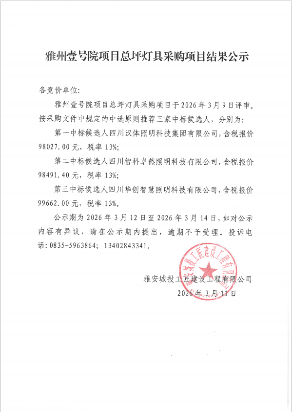 雅州壹號院項目總坪燈具采購項目結果公示