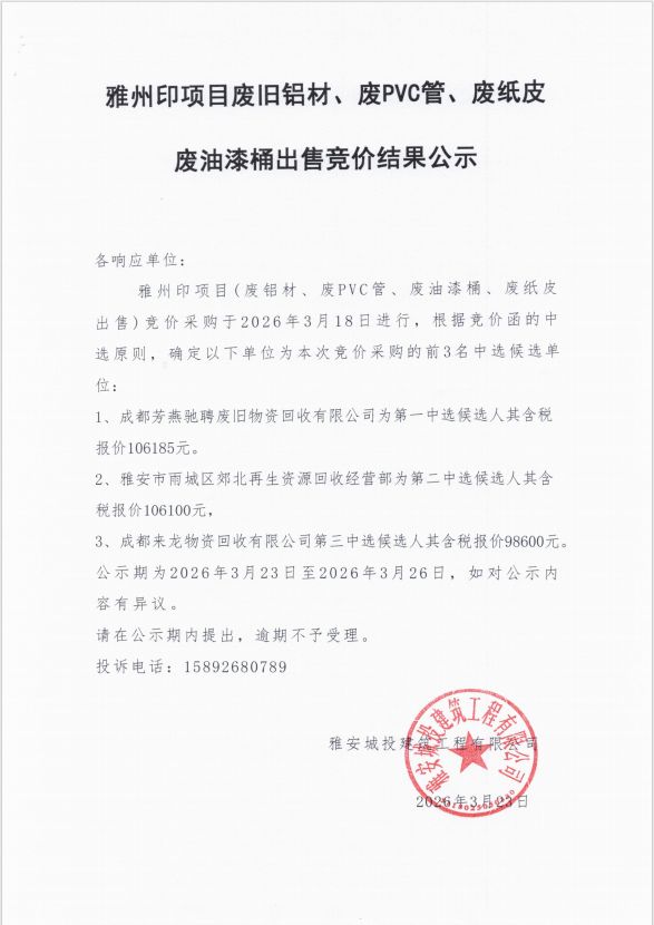 雅州印項(xiàng)目廢舊鋁材、廢PVC管、廢紙皮、廢油漆桶出售競價結(jié)果公示